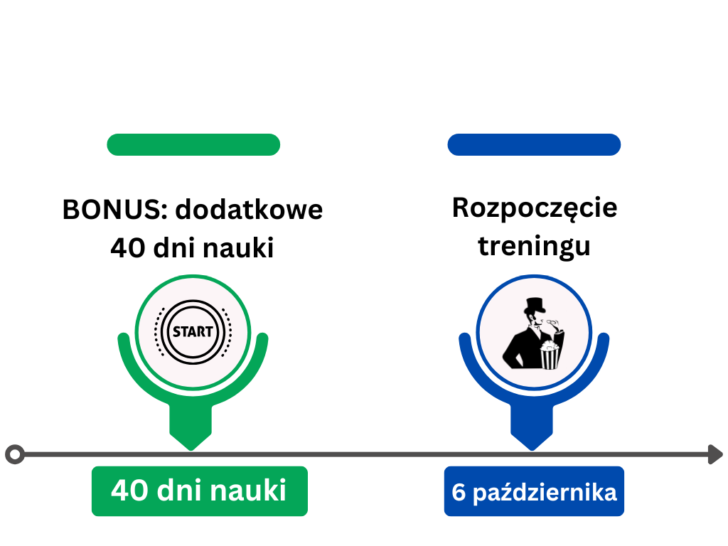 Otrzymujesz dostęp do platformy na 4 miesiące. Głowna część treningu to trwa 12 tygodni. Natomiast kupując trening do wtorku do 23:59, zyskujesz bonus w postaci dodatkowego roku dostępu, czyli w sumie dostęp trwa 16 miesięcy.